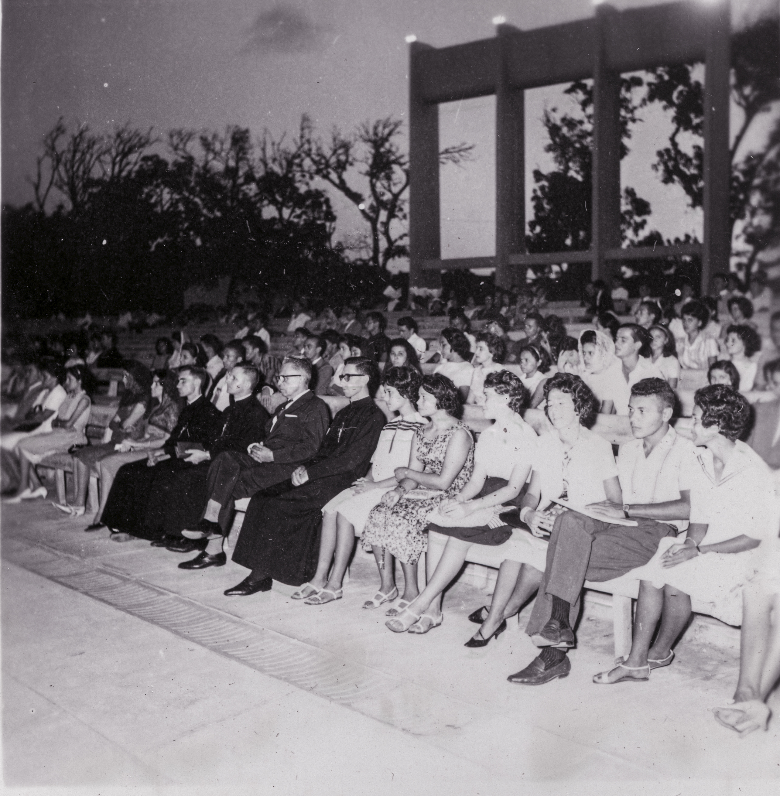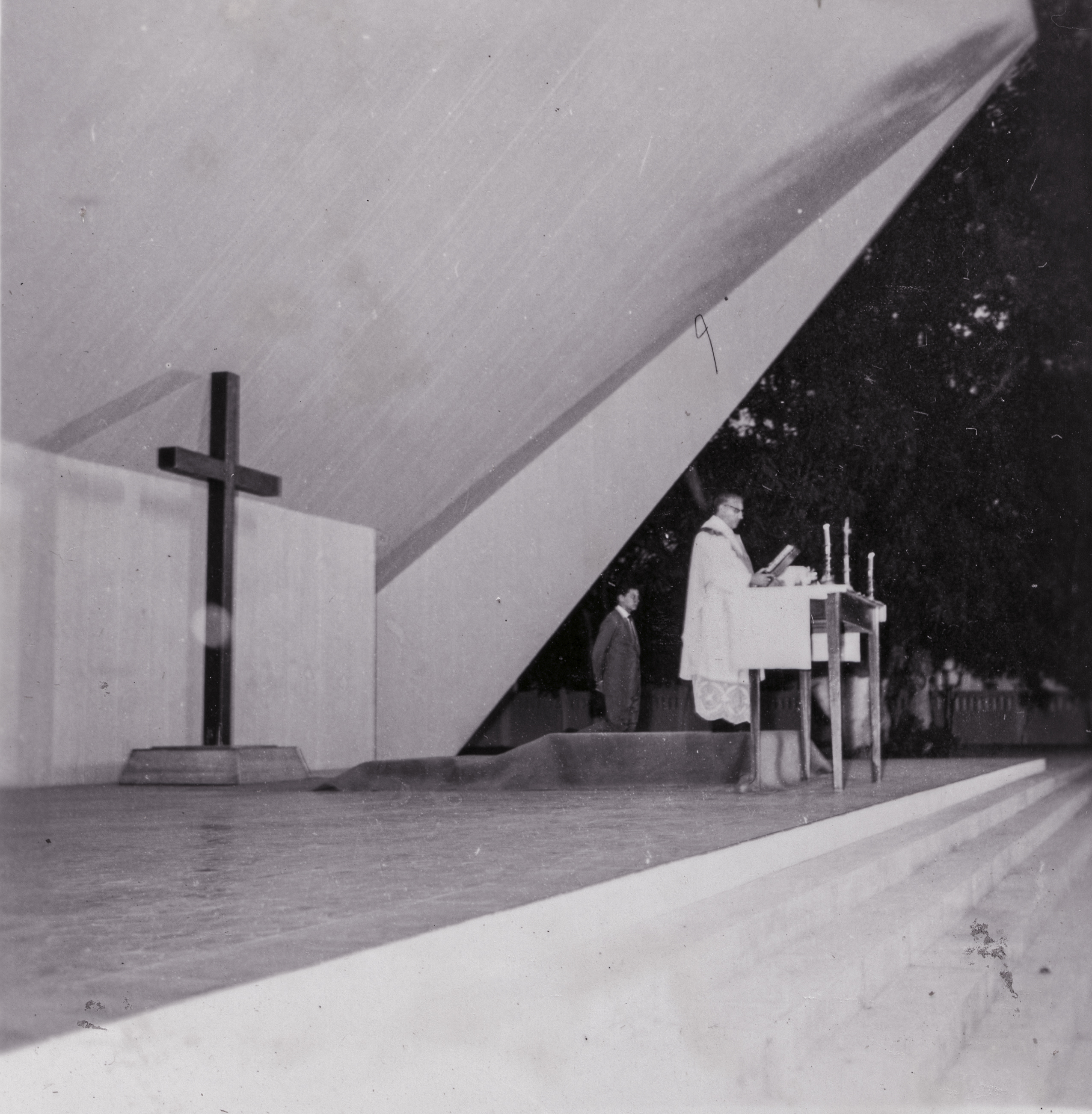 Descrição: Dois registros fotográficos da Missa Natalina realizada para os Estudantes na Concha Acústica em 25 de dezembro de 1962. O acervo Laboratório Fotográfico da Reitoria é constituído por cerca de 23 mil imagens produzidas entre 1961 e 1984. O Laboratório Fotográfico da Reitoria foi criado na década de 1960 com o intuito de produzir e guardar imagens da história da Universidade. Inicialmente, a Universidade do Ceará (UC) contratava empresas para realizar a cobertura dos eventos considerados importantes para a Reitoria. Em 1961 o então fotógrafo da ABAFILM, Antônio Evangelista Bomfim, foi contratado pela UC com o objetivo de que essa cobertura fosse feita por funcionários da instituição e que o documentário das ações da Universidade fosse mantido sob sua guarda, inclusive as imagens produzidas antes da criação do Laboratório. Não há informações precisas de que outros fotógrafos tenham participado desse registro, mas sabe-se que, até 1981, quando Evangelista pediu exoneração de seu cargo na Universidade, ele era o principal responsável pela produção das imagens. A escolha dos temas e eventos eram propostos pela Reitoria e as imagens eram produzidas pelo(s) fotógrafo(s). No organograma, o Laboratório era vinculado ao Serviço de Fotografia do Departamento de Educação e Cultura. Com a extinção deste Departamento, na década de 1970, passou a ser vinculado diretamente à Reitoria. Não foram, contudo, encontrados registros que documentem de forma clara essas vinculações. O Laboratório funcionava em um casarão perto da Igreja Nossa Senhora dos Remédios e, posteriormente, passou a funcionar no Pavilhão Antônio Martins Filho, na Escola de Arquitetura. O Laboratório, além de produzir e guardar o documentário fotográfico da Universidade, era responsável também por produzir slides utilizados em projetores nas aulas do curso de Arquitetura. Após a saída de Antônio Evangelista, em 1981, sabe-se que o Laboratório teve dificuldades de se manter. O acervo, eventualmente, passou a ficar sob a guarda do Museu de Arte da UFC, mas parte do material, em especial as imagens anteriores ao Laboratório, se perderam. Em 2015 o acervo foi doado pelo MAUC ao Memorial da UFC.